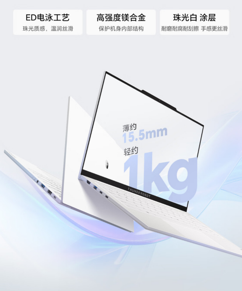 雷神aibook14Air采用全新【珠光白】配色,机身通体隐约珠光色泽,A面采用金属材质ED电泳工艺,美感兼具质感,键盘采用准分子类肤涂层,手感更细腻。整机轻约1kg,相当于随身携带两瓶矿泉水的重量,薄约15.5mm,轻松单手持握,放入随身包袋几乎无感,通勤差旅再无负担,移动办公从此自由随心。