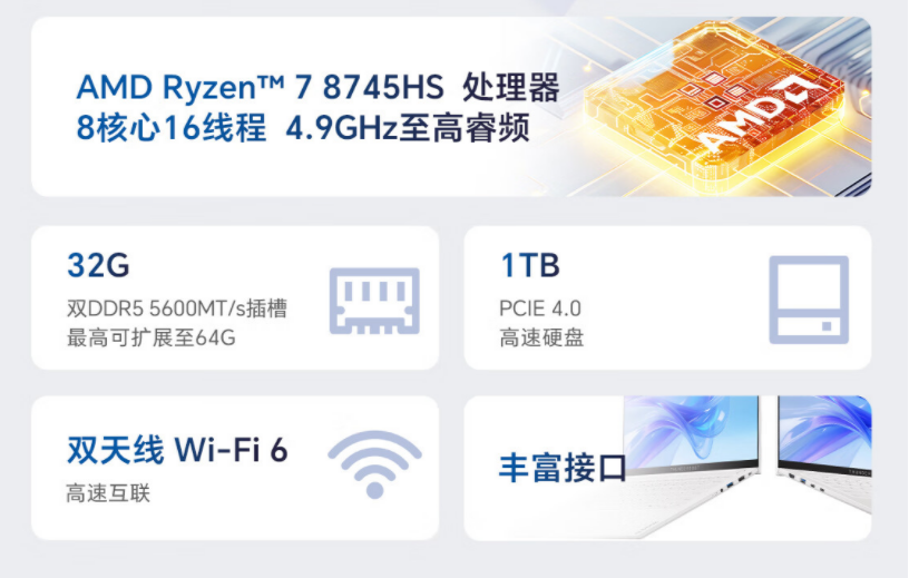 雷神aibook14Air配置全面升级,搭载AMD锐龙R78745HS处理器,采用4nm制程工艺,Zen4架构带来性能的迅猛升级,多项任务协同能力大大提升,应对专业设计、日常创作等重度办公绰绰有余。