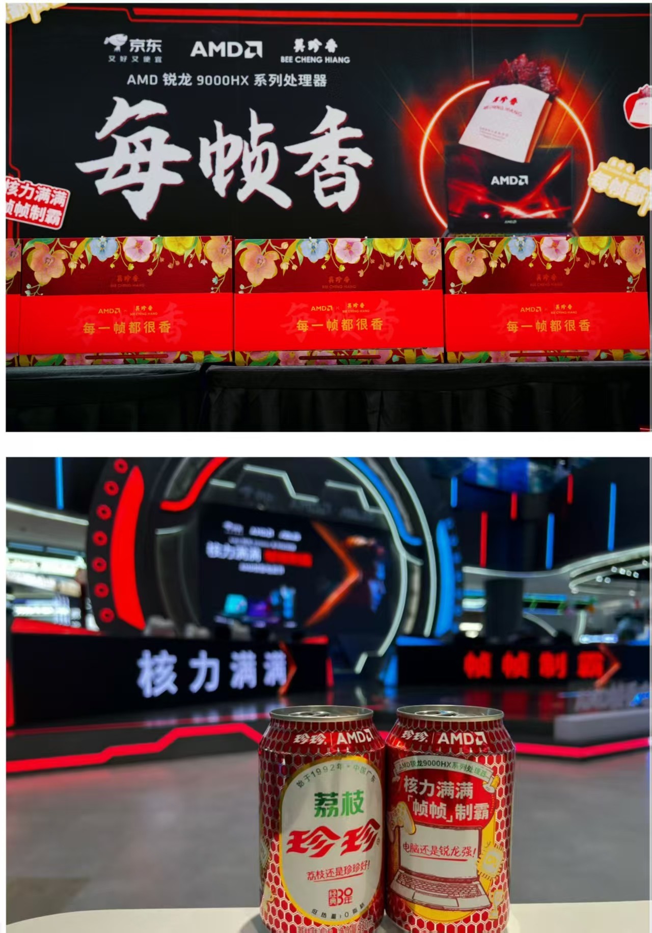为了让玩家朋友在周末“吃好,喝好,玩好,买到称心好电脑!“AMD特别联合百年匠心肉品品牌美珍香、陪伴一代成长的经典饮料品牌珍珍,喜爱游戏的玩家都知道,每一个游戏的精彩时刻若没有”精美小食“的陪伴总会感觉缺了什么!AMD精选百年传承的美珍香,让玩家亲身感受AMD锐龙9000HX游戏笔记本带来的超级畅爽游戏体验--”高帧更高,Low帧更稳“!发一个大招,吃一片肉脯…真的是”美珍香“!”每帧都香!“作为陪伴年轻人一起成长的童年记忆”珍珍“荔枝饮品更是