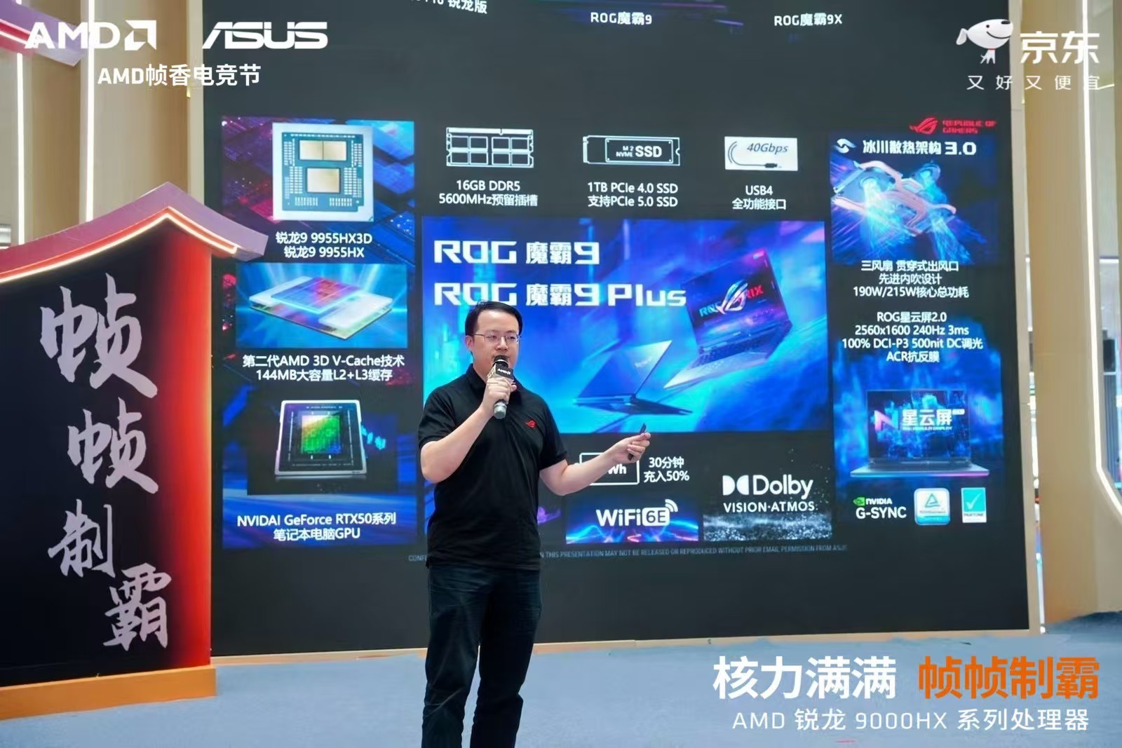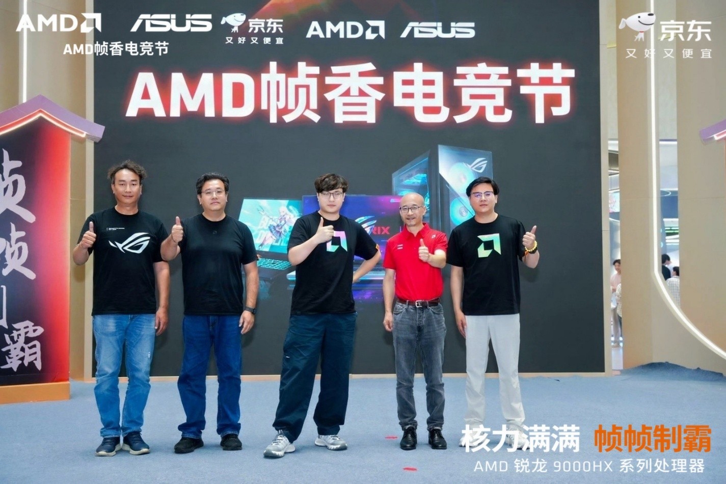 AMD大中华区销售副总裁晁亚新、AMD大中华区市场营销副总裁纪朝晖、华硕电脑系统平台渠道运营中心总监林桀民,京东笔记本业务部华硕组负责人,知名游戏主播“老飞宇66”共同登台为“AMD帧香电竞节”揭幕。