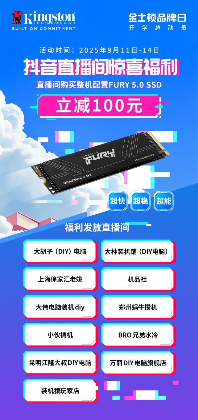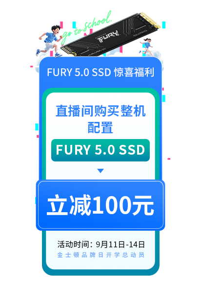 所以,聪明的用户当然知道把握时机,在金士顿品牌日开学总动员活动期间,通过抖音直播间购买整机配置时,KingstonFURY叛逆者(Renegade)G5PCIe5.0 NVMe固态硬盘已然成为必选项,毕竟立减100元的实惠确实香!