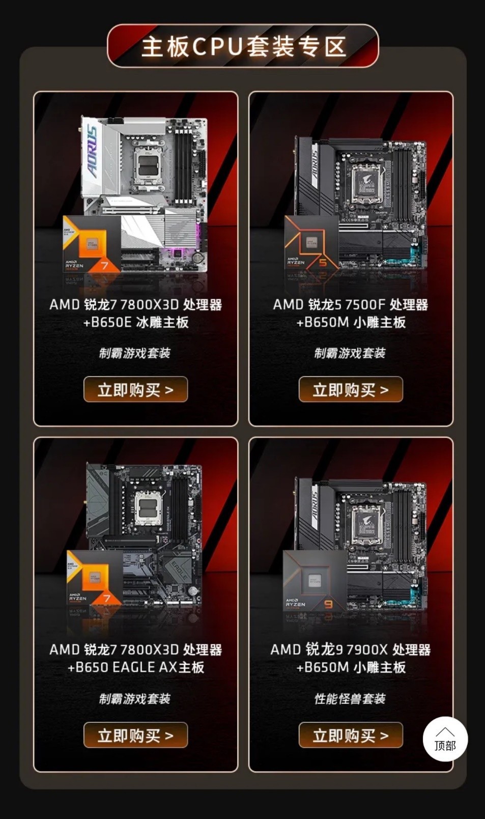 除了爆品CPU单品之外,活动页面有很多AMD锐龙处理器的板U套装和卡U套装,这些结合了AMD和合作伙伴芯片组产品和显卡产品的套装不仅搭配起来相得益彰,套装价格更是优惠,方便大家一站购全想要的硬件产品。