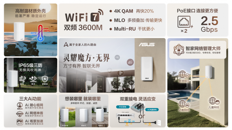 在智能家居与户外网络需求日益融合的今天,华硕全新推出灵耀魔方无界WiFi7路由器,以“方寸有界,智联无界”为理念,将高速网络的覆盖范围从室内真正延伸至户外。这款路由器不仅搭载WiFi7技术,更拥有突破性的户外适应性:IP65级防水防尘防雷击与高耐温材质外壳,使其成为庭院、别墅及半户外场景中的理想网络中枢。