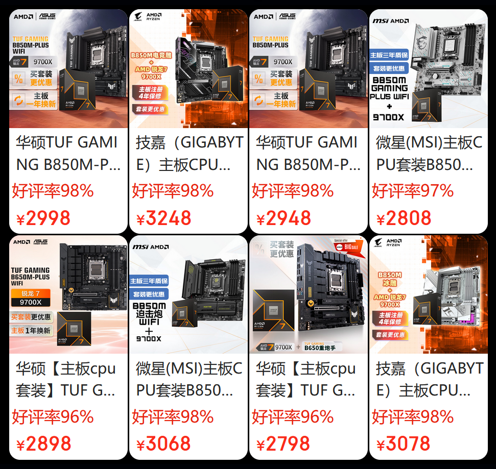 除了爆品CPU单品之外,活动页面有很多AMD锐龙处理器的板U套装和卡U套装,这些结合了AMD和合作伙伴芯片组产品和显卡产品的套装不仅搭配起来相得益彰,套装价格更是优惠,方便大家一站购全想要的硬件产品。