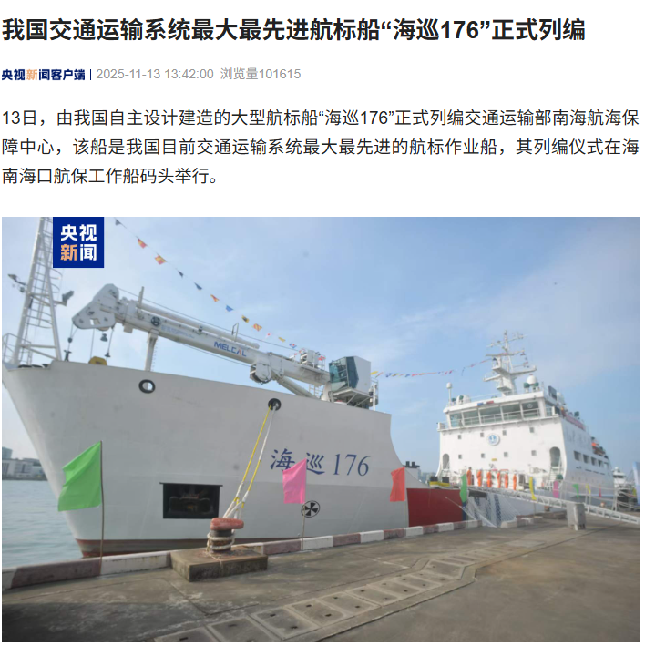 2025年11月13日,我国自主设计建造的大型航标船“海巡176”正式投入运行,列编仪式在海南海口航保工作船码头举行。该船由交通运输部南海航海保障中心接收管理,是目前我国交通运输系统内吨位最大、技术最先进的航标作业船舶。