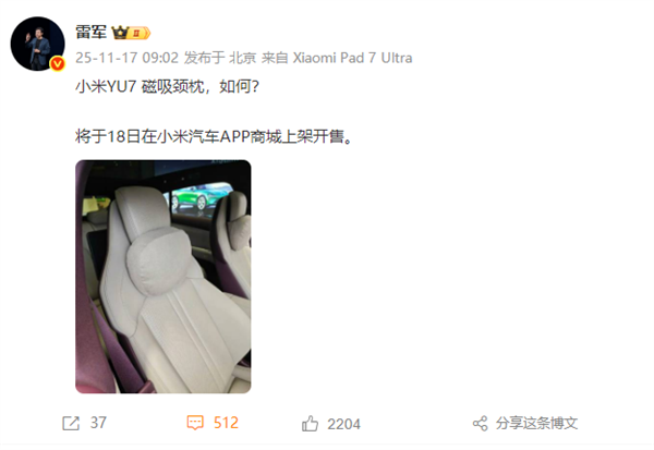 2025年11月17日,小米集团创始人、董事长兼CEO雷军宣布,小米YU7磁吸颈枕将于次日在小米汽车App商城正式发售。