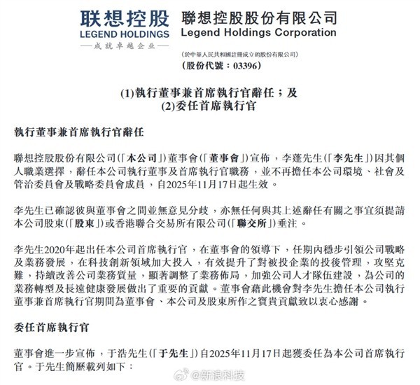 ÁªÏë¿Ø¹ÉÓÚ2025Äê11ÔÂ17ÈÕ·¢²¼¹«¸æ£¬Ðû²¼ÀîÅîÒò¸öÈËÖ°Òµ¹æ»®ÔÒò´ÇÈ¥¹«Ë¾Ö´Ðжʼ°Ê×ϯִÐйÙÖ°Îñ£¬Í¬Ê±²»ÔÙµ£Èι«Ë¾»·¾³¡¢Éç»á¼°¹ÜÖÎίԱ»áÓëÕ½ÂÔίԱ»á³ÉÔ±£¬Ïà¹Ø±ä¶¯×Ôµ±ÈÕÆðÕýʽÉúЧ¡£Í¬ÈÕ£¬¶Ê»á¾ö¶¨ÈÎÃüÓÚºÆÎªÐÂÈÎÊ×ϯִÐй٣¬¼´Ê±½ÓÈΡ£