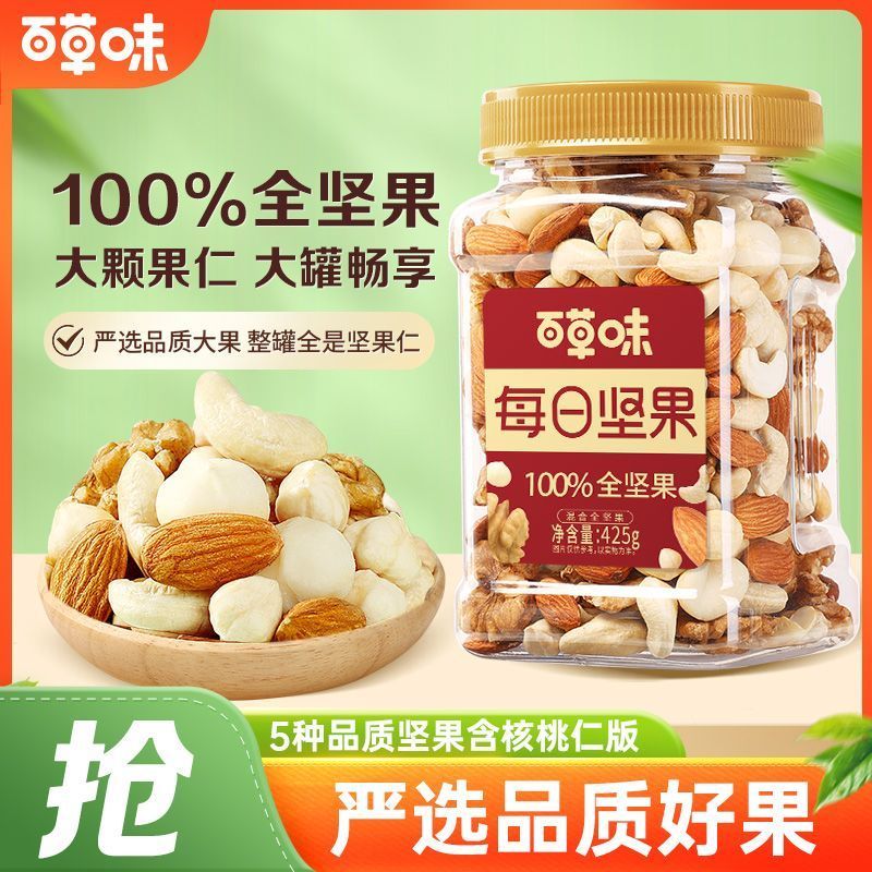 百草味混合全坚果仁425g大包装综合坚果,甄选优质坚果原料,包含核桃仁、腰果、巴旦木、开心果、榛子等多种美味坚果,营养丰富口感香脆,满足全家每日所需,独立小袋包装方便携带,适合办公休闲、居家追剧或户外出行享用。