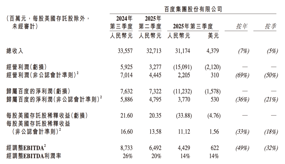 2025年第三季度,百度公布财务业绩,当季总营收为312亿元,较去年同期及上一季度分别下降7%和5%。财报显示,因计提长期资产减值162亿元,公司当季录得经营亏损151亿元,净亏损112亿元。若不考虑该项减值影响,基于非公认会计准则计算,公司实现经营利润22亿元,净利润达...