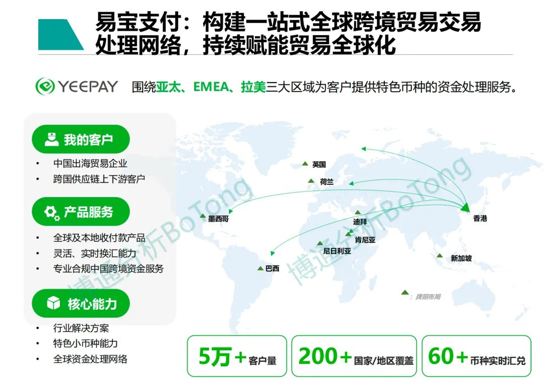 ÔÚÈ«Çò²¼¾Ö·½Ãæ,Ò×±¦Ö§¸¶ÒÑÔÚÐÂ¼ÓÆÂ¡¢Ïã¸Û¡¢Ó¢¹ú¡¢ºÉÀ¼¡¢µÏ°Ý¡¢¿ÏÄáÑÇ¡¢Ä«Î÷¸ç¡¢°ÍÎ÷¡¢ÄáÈÕÀûÑǵÈÖØÒªµØÇø½¨Á¢ÅÆÕÕ×ÊÖÊ»òÍê³É·þÎñÍøÂ罨Éè,ÒµÎñ·¶Î§ÑÓÉìÖÁ200¶à¸ö¹ú¼ÒºÍµØÇø,Ö§³Ö60¶àÖÖ»õ±ÒµÄʵʱ¶Ò»»,ÀۼƷþÎñÆóÒµ¿Í»§³¬¹ý5Íò¼Ò¡£ÕâһȫÇò»¯Ìåϵ²»½öΪÆóÒµÌṩÁË¡°±¾µØ»¯·þÎñ+È«ÇòÐͬ¡±µÄ»ù´¡ÉèÊ©,»¹Õë¶ÔÑÇÌ«¡¢Å·ÖÞÖж«·ÇÖÞ¡¢ÀÃÀÈý´óºËÐÄÇøÓò,½¨Á¢Á˶ÀÌØµÄС±ÒÖÖ×ʽð´¦ÀíÄÜÁ¦,ÇÐʵ½â¾öÁËÐÂÐËÊг¡¿ç¾³½»Ò×ÖеĻõ±Òת»»À§ÄÑ¡£