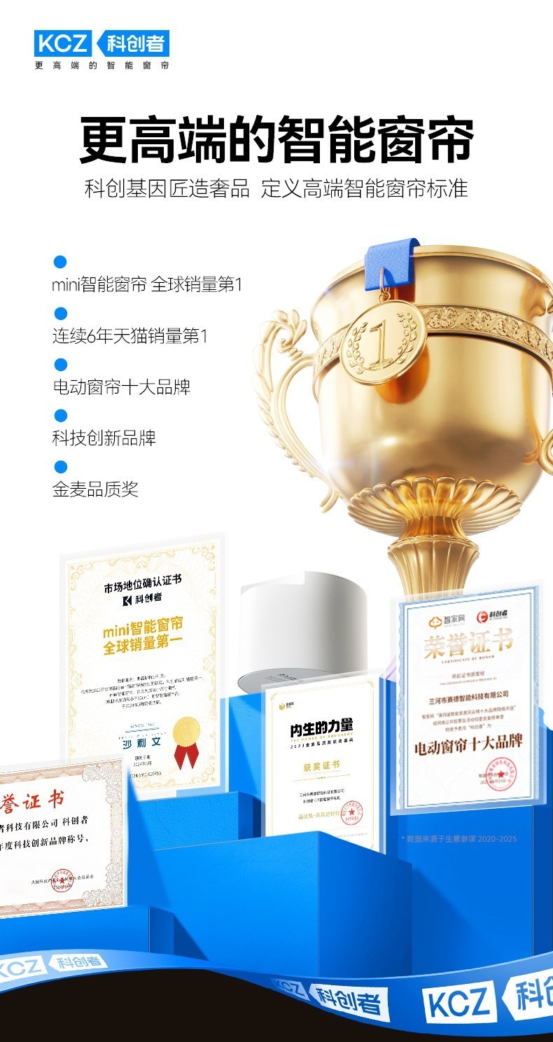 市场地位:科创者(KCZ)作为智能窗帘领域的先驱者、mini智能窗帘开创者,科创者实力强劲,不仅是mini智能窗帘全球销量第一,连续6年天猫销量冠军,位列电动窗帘十大品牌,还荣获科技创新品牌、金麦品质奖等多项荣誉,更拥有国家级3A诚信企业、3A级诚信供应商、3A级质量服务诚信单位、3A级重合同守信用单位、3A级诚信示范单位等资质认证,以科创基因匠造奢品,用3A诚信品质定义高端智能窗帘标准,搭配充电4小时、续航半年的超强性能,为用户带来便捷与品质兼具的智能体验。