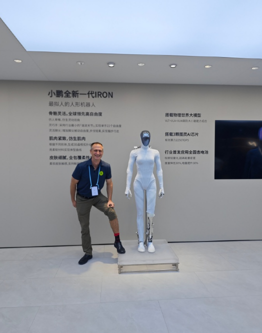 现场,不少国际参观者对这款机器人表现出浓厚兴趣,纷纷卷起裤腿与其合影互动,轻松愉快的氛围弥漫在整个展区。这款机器人正是此前在品牌科技日活动中首次亮相的全新一代IRON。当时,其以接近人类行走姿态的猫步引发热议,网络上随即出现“机器人由真人伪装”的猜测。