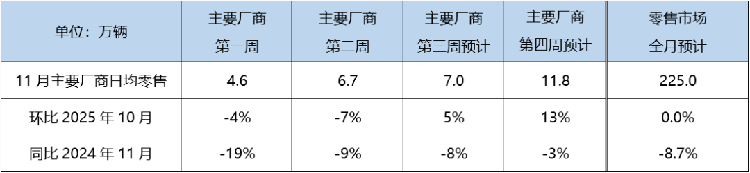从周度表现来看,11月市场走势呈现逐周回暖趋势。第一周日均零售量为4.6万辆,同比下滑19%,环比下降4%,开局相对平淡。第二周适逢“双十一”购物节点,车企加大促销力度,日均零售回升至6.7万辆,虽仍同比下降9%,环比亦微降7%,但市场活跃度有所提升。第三周伴随广州车展举办以及购置税优惠退坡预期升温,日均零售预计达7.0万辆,同比下降8%,环比增长5%。进入下旬,第四周在政策调整预期和年底冲量双重驱动下,市场热度进一步上升,日均零售预计可达11.8万辆,同比降幅收窄至3%,环比增长13%。