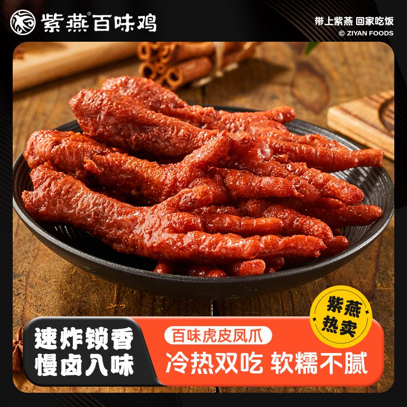 紫燕百味鸡虎皮凤爪来啦!这款 500g 的虎皮凤爪可是超棒的卤味零食,口味是经典的香辣味。鸡爪经过精心卤制,虎皮纹理清晰,肉质软糯有弹性,一口下去香辣过瘾,让人欲罢不能。