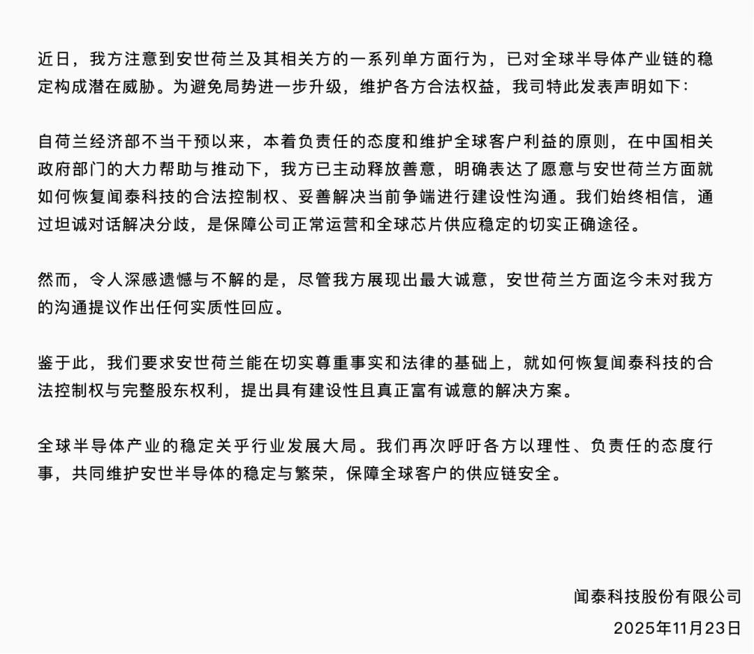 2025年11月24日,闻泰科技就荷兰子公司安世半导体控制权事宜再次发布声明,呼吁相关方积极回应,推动问题通过沟通协商妥善解决。
