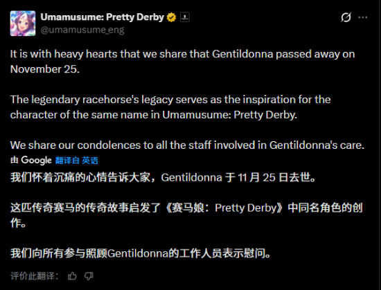 退役后,“贵妇人”自2014年起移居北海道北部牧场,作为繁殖母马延续血脉。据所属俱乐部透露,其离世过程安详,具体原因未予公布。该赛马也是广受欢迎的跨媒体作品中同名角色的原型,相关项目已通过社交平台对其表示深切悼念。