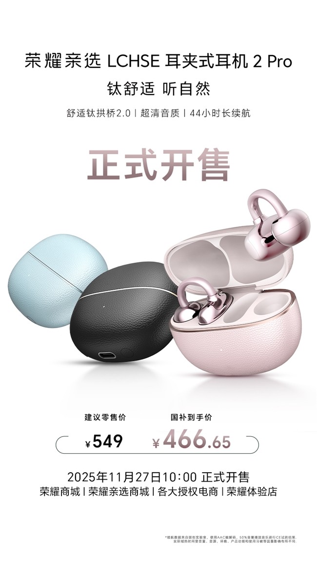 目前, 荣耀耳夹耳机2 Pro已在11月27日10:00全渠道开售,共有典雅黑、玫瑰金、天青釉三款时尚配色可选,上天猫买荣耀耳夹耳机2 Pro,新品立享国补15%,前300名还送专属定制耳机包,国补到手价466.65元。