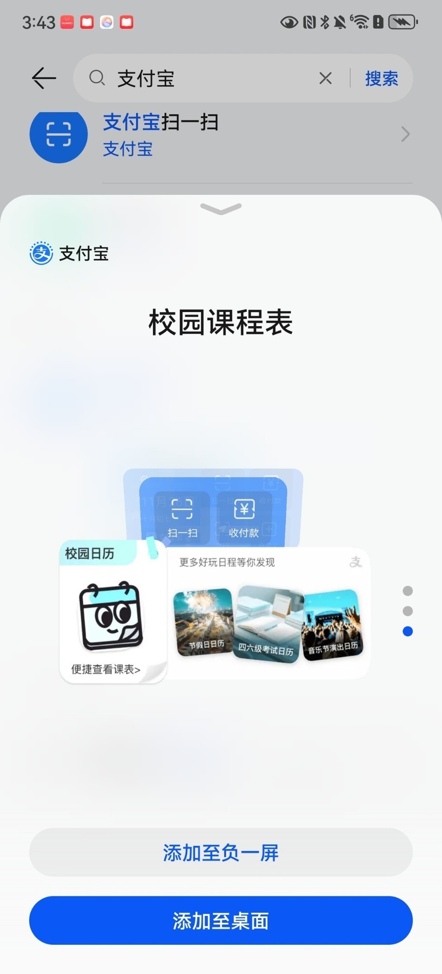 1、在华为负一屏顶部搜索框中输入“支付宝”“学生课表”或“学生课表添加”等关键词,直接定位并添加课程卡片;