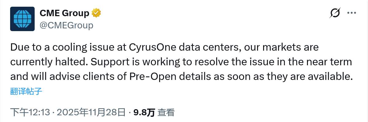 11月28日,芝加哥商品交易所集团作为全球主要的金融衍生品交易平台,其业务涵盖农产品、能源、股指、外汇、利率及金属等各类期货与期权产品。今日北京时间12时13分,对应芝加哥当地时间27日晚上10时13分,该机构通过社交平台发布消息称,因服务供应商CyrusOne所属数据中心遭遇冷却系统故障,导致交易系统无法正常运行,市场交易临时中断。截至目前,该交易所尚未发布关于系统恢复进展的进一步信息。