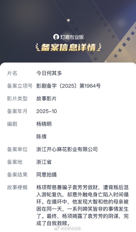 11月28日,根据影视备案信息显示,由杨晓明与陈倩共同编剧的电影今日何其多已正式备案立项。该片备案单位为浙江开心麻花影业有限公司,该公司此前曾参与出品由沈腾、马丽领衔主演的喜剧影片抓娃娃。本片是开心麻花团队主导创作的一部融合复仇、奇幻与喜剧元素的全新作品,聚焦于时间循环这一富有想象力的题材。