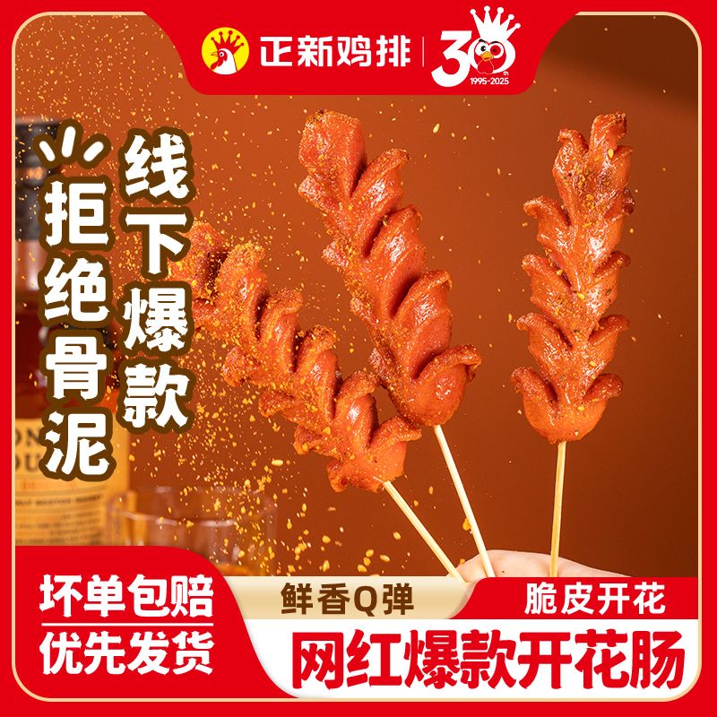 正新开花脆皮肠是一款美味的鸡肉肠,是备受欢迎的油炸小吃。它口感鲜美,鸡肉的香味浓郁,经过油炸后外皮金黄酥脆,内里鲜嫩多汁,开花的造型也十分独特,让人看着就有食欲。