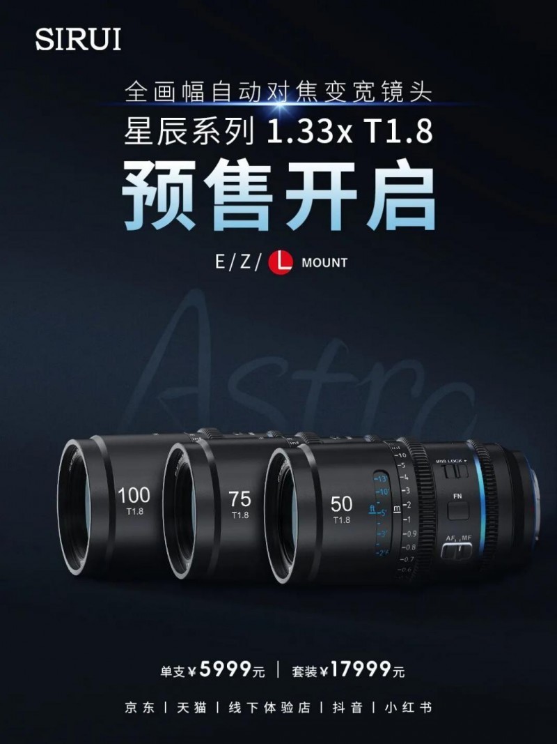 全画幅+自动对焦+变宽镜头,在变宽领域来说可谓首次出现的王炸组合,其代表着高精专光学影像领域的进一步突破,也翻开了改写行业格局的新篇章。思锐星辰系列在海外众筹上线半个月即破41W美金销售额,获得300+名创作者支持,足以展示大众对该规格的热切期盼。12月1日,现于国内正式开启预售,单品5999元,三镜头套装17999元,首发E/Z/L三款卡口,预计12月中旬发货。