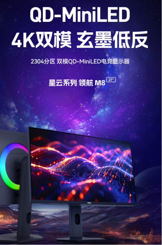 在显示器技术日新月异的今天,HKC作为显示行业的领军品牌,再次以创新科技引领潮流,推出了星云系列领航M8MiniLED显示器。这款集顶尖显示技术于一身的力作,不仅支持4K@160Hz/FHD@320Hz双模,还搭载了玄墨低反屏与HDR1400高动态范围显示,以首发3299元的亲民价格,为电竞爱好者、专业设计师及影视发烧友带来了前所未有的视觉盛宴。