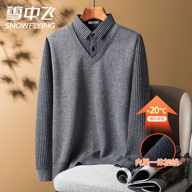 雪中飞为爸爸们带来了一款男士加绒加厚假两件针织衫毛衣。它是保暖的衬衫领上衣,设计贴心,假两件的款式增添了时尚感,加绒加厚的材质能在寒冷天气为爸爸提供温暖呵护。