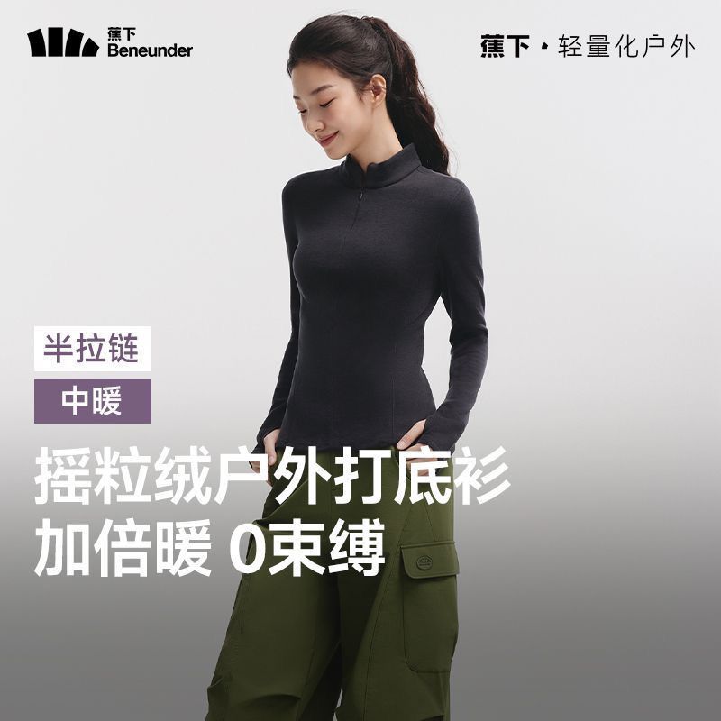 Beneunder蕉下这款女士半拉链长袖摇粒绒打底衫,是当下实用又时尚的选择。摇粒绒材质柔软亲肤,上身舒适感极佳,半拉链的设计方便穿脱,还能根据需求调节领口的开合程度,实用性满满。