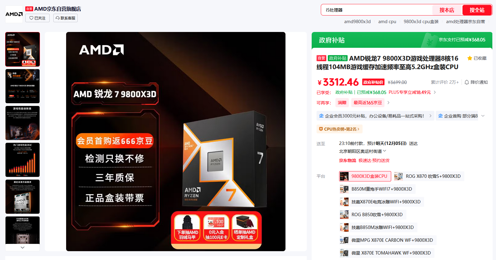 转眼间已经进入了2025年的12月,年终时刻的促销真的是琳琅满目,而对于PC玩家来说当然就是在等待STEAM的冬季大促了,届时将会有上千款游戏大作参与其中。而广大DIY玩家们需要准备好的当然就是一套给力的电脑整机平台了,今天就为准备在年底攒机的朋友们推荐一款今年在京东商城11.11大促期间拿下销冠的处理器-AMD(超威)锐龙9 9800X3D,而且这款产品正在享受“政府补贴价”,综合算下来已经来到了