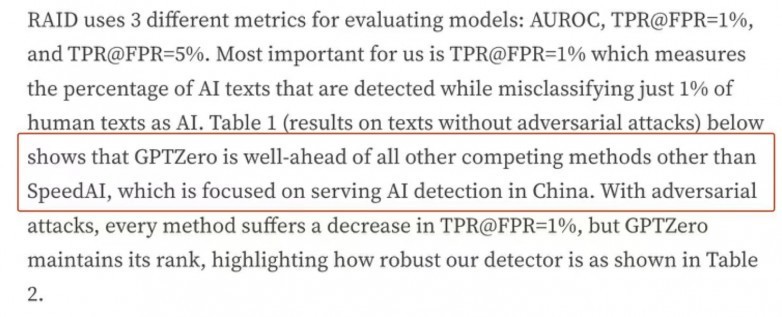 国内AI安全领域迎来里程碑式突破。由北京航空航天大学顶尖计算机博士、硕士团队创立的飞驰星辰公司,今日正式公布其研发的AI生成内容检测产品——SpeedAI。该产品凭借其卓越的技术创新与性能,在全球权威基准测试中脱颖而出。尤为引人注目的是,美国知名AI检测公司GPTZero在其2025年10月发布的官方报告《GPTZero:官方评选最准确的商业AI检测器》中指出“GPTZero在除SpeedAI外的所有竞争方法中遥遥领先,后者专注于在中国提供AI检测”,公开承认SpeedAI是其在全球范围内的核心竞争对手,并在第三方测试中展现出更优越的性能,这标志着中国在AI应用及治理领域取得了关键性的领先地位。