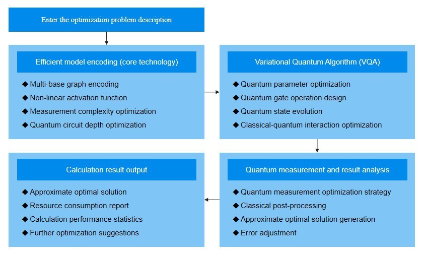 传统的量子优化算法主要依赖于变分量子算法(VQA)框架,其中量子线路的深度往往较高,使得计算资源的需求难以满足。而微云全息提出的高效模型编码技术通过两项关键创新突破了这一限制:多基图编码和非线性激活函数的应用。