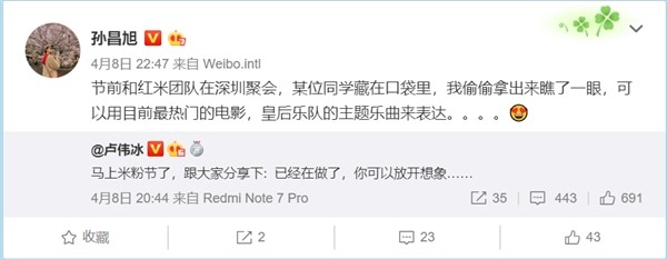 小米产业投资部合伙人孙昌旭转发了卢伟冰的微博并表示:节前和红米团队在深圳聚会,某位同学藏在口袋里,我偷偷拿出来瞧了一眼,可以用目前最热门的电影,皇后乐队的主题乐曲来表达。