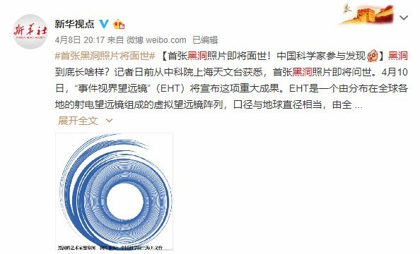 中关村在线消息:4月9日,日前,新华社在新浪微博发文称:经过全球科学家多年以来的努力,人类史上首张清晰的超级黑洞照片将于北京时间4月10日21时在全球多地同步发布 。这项重大成果由“事件视界望远镜”(EHT)完成,这是一个由分布在全球各地的射电望远镜组成的虚拟望远镜阵列,口径与地球直径相当。