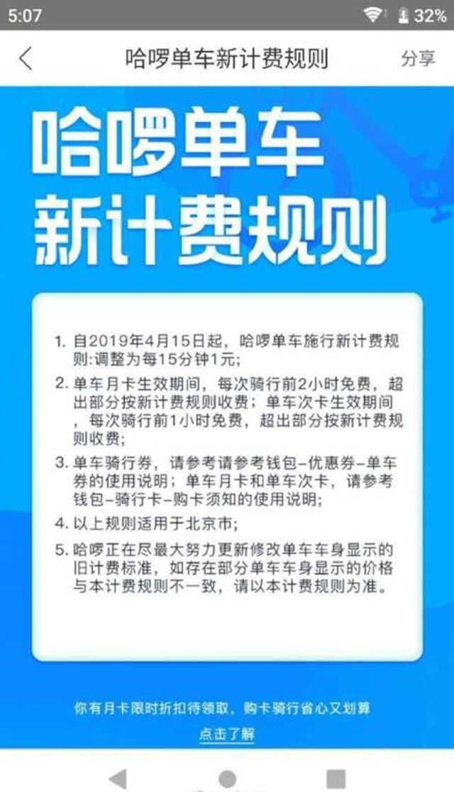 中关村在线消息:北京时间4月9日,随着摩拜单车小蓝单车涨价之后,哈啰单车也加入了涨价的大军。哈啰单车今天公布了全新的计费规则,自今年4月15日开始,调整为每15分钟收费1元。根据现有规则计算,一个小时收费达到了4元。
