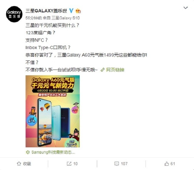 中关村在线消息:4月30日,三星官方今日宣布Galaxy A60元气版正式开启预订,该机起售价为1499元,有两种内存规格可供选择。