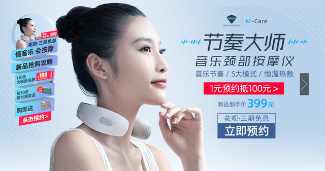 机械师音乐颈部按摩仪现正在机械师天猫旗舰店热卖中,1元预约可抵100元,点击链接即刻解锁潮流按摩新模式