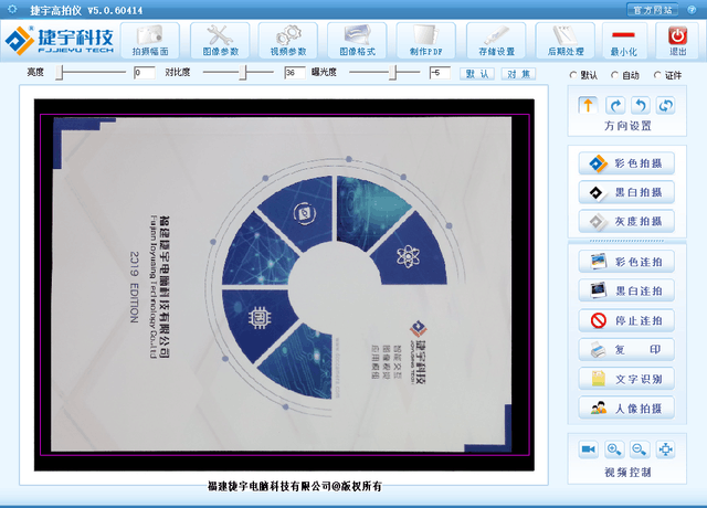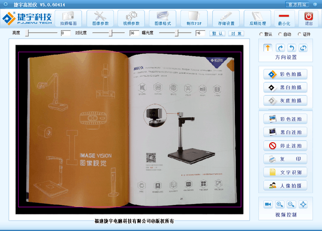 捷宇K系列高拍仪不仅最大支持A3幅面的拍摄,还可扫描图书、文件、杂质、图片、立体实物等。同时提供了丰富的软件功能:包括图片合成、自动连拍、一键PDF、打印、条码识别、OCR、录像和拍摄等多种功能,此外,捷宇K系列高拍仪软件还支持画面旋转、大小缩放等功能。在设置方面,捷宇K系列高拍仪提供亮度调节、自动纠正、图片质量调整、视频设置等。
