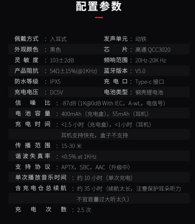 相较于上一代JEETAIR蓝牙耳机,JEETAirPlus有很大提升,(参数图如下)这款耳机采用全新高通芯片、LDS镭射激光雕刻天线以及远距离射频技术,蓝牙连接稳定性大幅提升35%。音质方面因为采用的是全频动铁的配置,所以解析力较强,瞬态表现好,对音乐的动态表现、瞬间细节表现都是非常优异的。