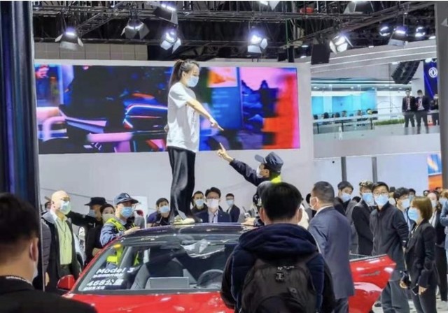 4月19日,上海车展现场的特斯拉展台上,一名女子身穿“刹车失灵”的衬衫,站在车顶上大喊“特斯拉刹车失灵”,事件引起众人围观。