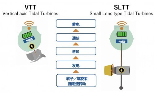 (左SLTT (Small Lens type Tidal Turbines)、右VTT (Vertical axis Tidal Turbines)