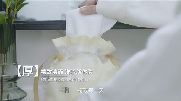 视频以女主早晨的生活场景为切入点,为大家带来了4件产品,分别为日抛型棉柔洗脸毛巾(卷巾)、日抛型棉柔洗脸毛巾、婴幼儿柔湿巾、轻松款棉柔洗脸巾。早上醒来,阳光透过窗帘映射到屋内,美好的一天,从洁面开始,女主抽出一张「日抛型棉柔洗脸毛巾(卷巾)」,100g加厚加重,如云朵般棉柔,厚到连小毛巾都羡慕,带来洗脸新体验。