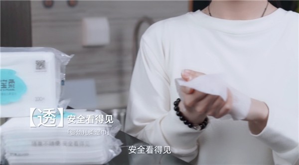 吃完食物,女生轻轻抽出「婴幼儿柔湿巾」进行擦拭,洁净的同时,更要注重质量,「婴幼儿柔湿巾」以全新的产品体验,用全透明包装,安全的品质,看见的健康让用户在使用中更放心。
