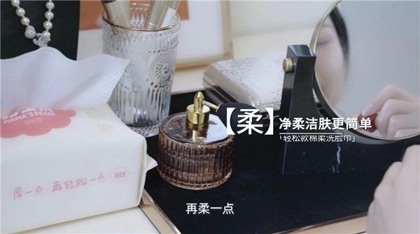 在最后的场景中,女生口红涂不均匀,打开「轻松款棉柔洗脸巾」,轻轻擦拭嘴唇。厚一点,再柔一点,为每一处肌肤舒适而努力,呵护你的娇嫩肌肤,让精致的生活完美呈现。