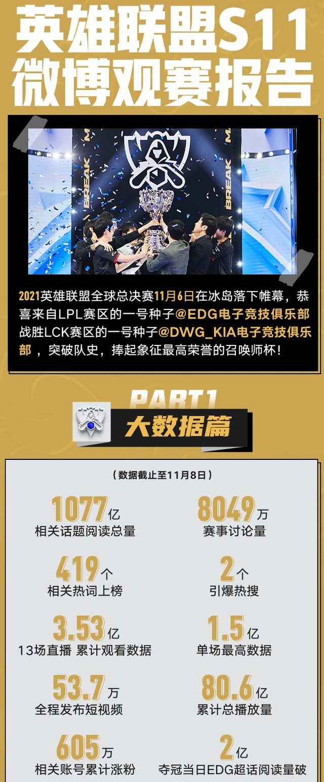2021英雄联盟全球总决赛(以下简称“S11”)在冰岛落下帷幕,来自LPL赛区的一号种子EDG电子竞技俱乐部捧起召唤师杯,获得赛事冠军。11月16日,连续五年成为英雄联盟全球赛事官方战略合作社交平台的微博也披露了自己的成绩单。