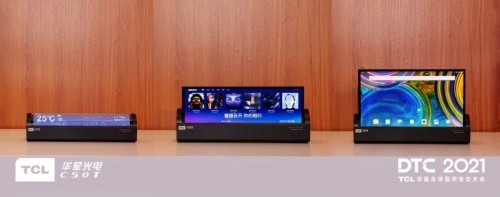 除了5款代表性的全球首发产品,TCL华星还展示了超过50款包含Mini LED直显、Micro LED直显、印刷显示、柔性显示、3D悬浮触控光场显示及新型材料领域的创新成果,从小尺寸的可穿戴设备、智能手机,中尺寸的平板、笔电,到大尺寸的TV面板、商业显示设备,大中小尺寸面板一应俱全,赋能娱乐、教育、办公、医疗、出行、商显等多种应用场景。